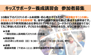 「BASKETBALL CLINIC ×中川聴乃さん」長崎県内のU12チームの皆様にご案内いたします。参加ご希望の方は、以下(実施要項・参加募集)をご確…